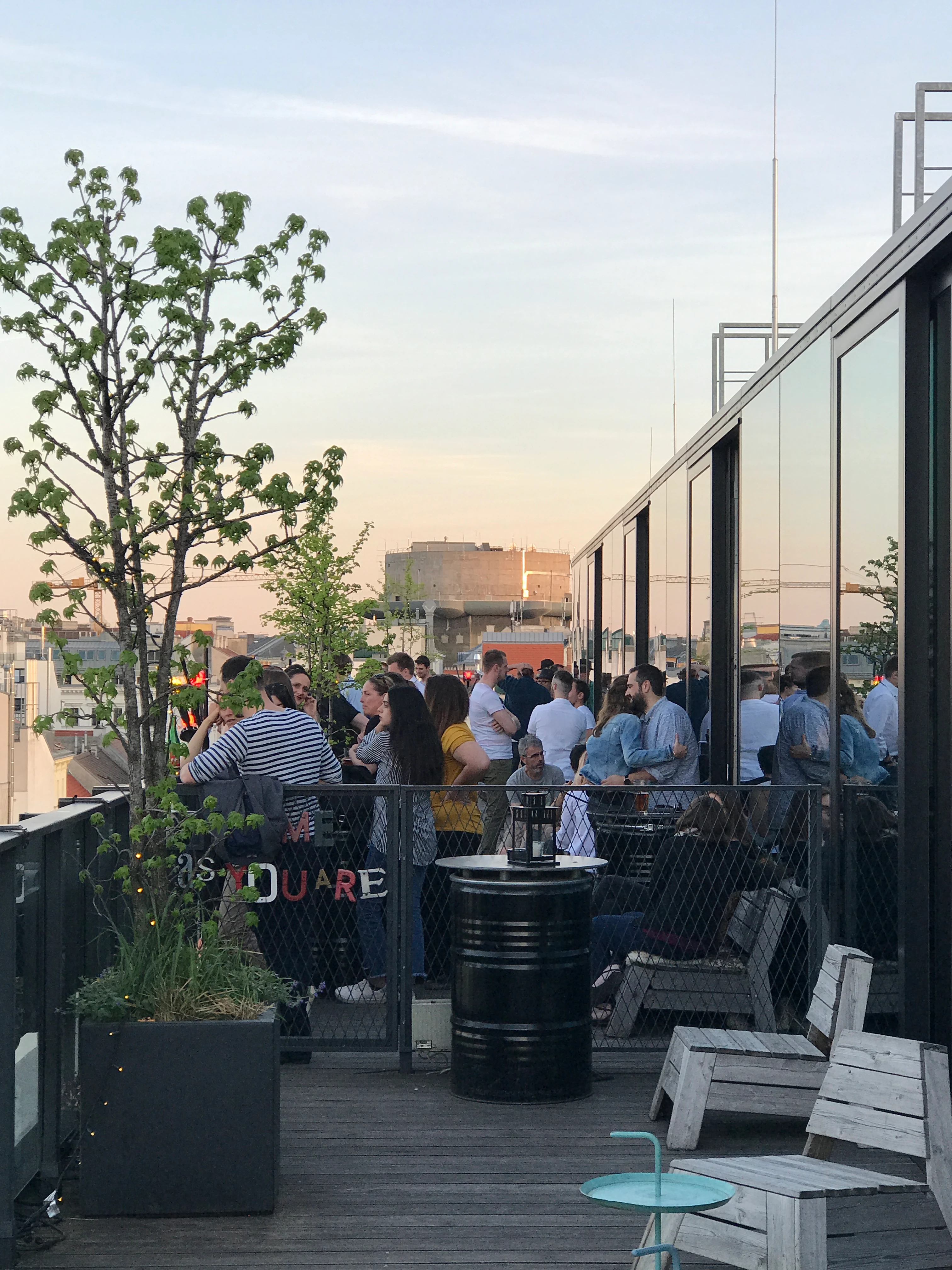 Unterm Dach gibt es die beste Aussicht und die beste Atmosphäre. Das Wohnzimmer über den Dächern der Stadt ist als Raumkontinuum geplant und passt sich den Erfordernissen des Tages an. Nachmittags ein ruhiger Arbeitsplatz oder eine gemütliche Lounge und abends der Afterwork-Hotspot. Das Highlight ist die Dachterrasse mit fantastischem Blick über Wien – und bei guter Sicht sogar bis zu den Weingärten Korneuburgs. Auf der Karte stehen – passend zum siebten Bezirk – lokale, individuelle Cocktails zu fairen Preisen. Am Wochenende gibt’s Bali Brunch.